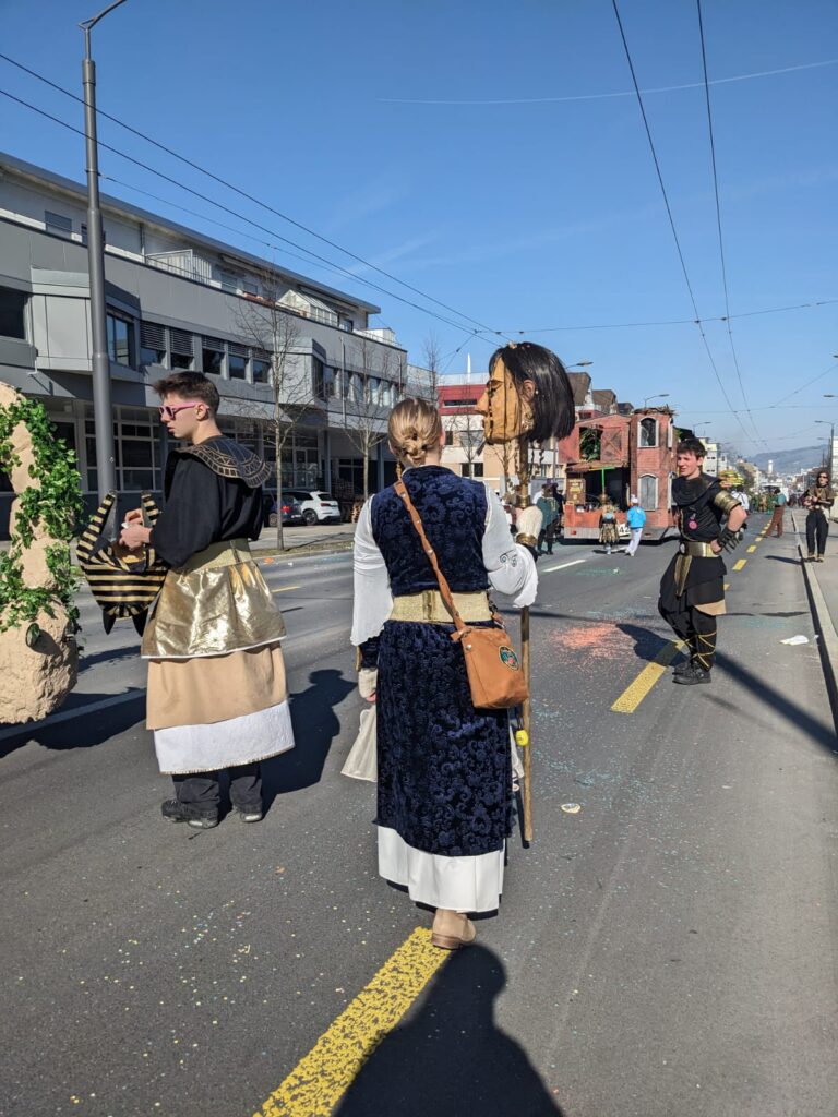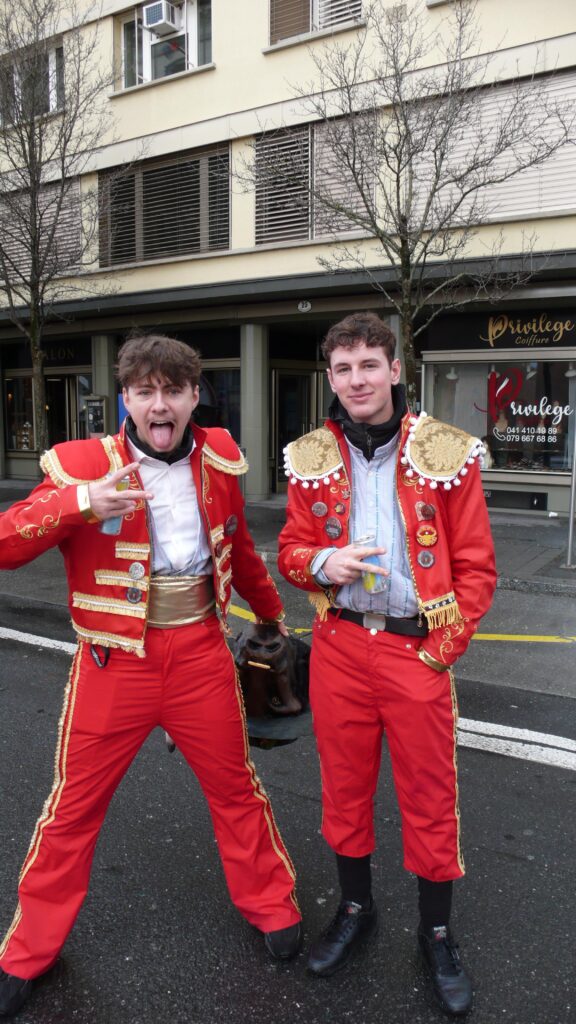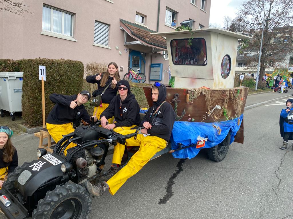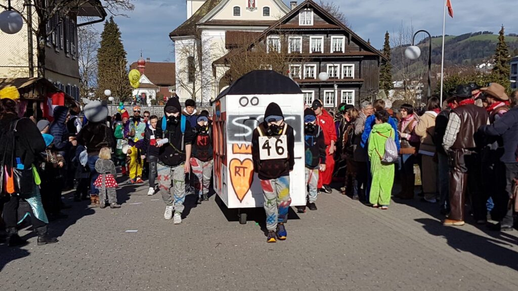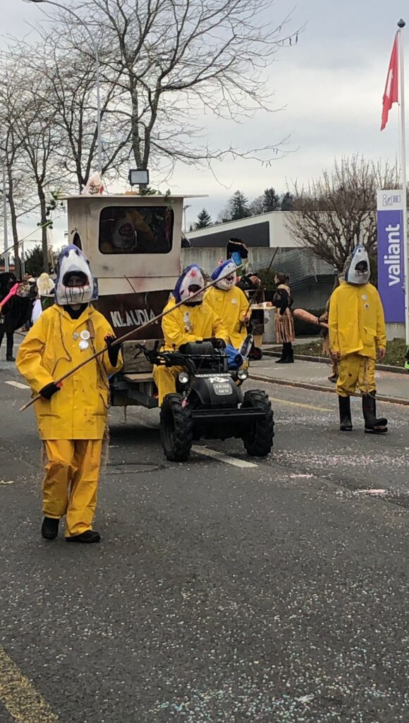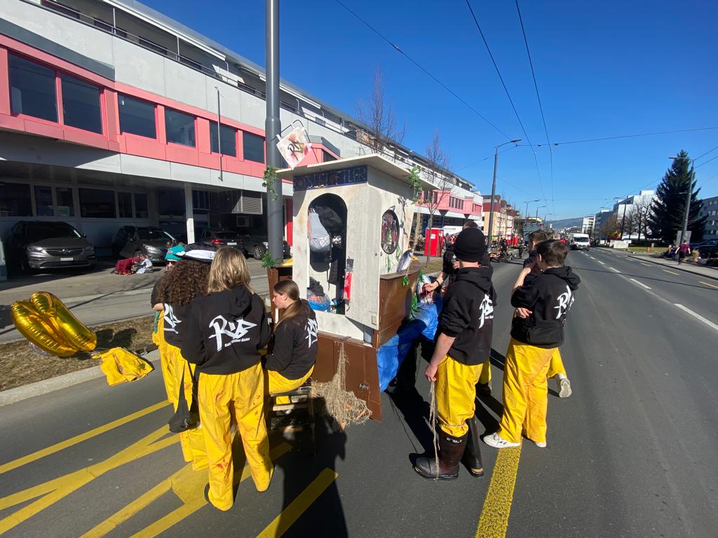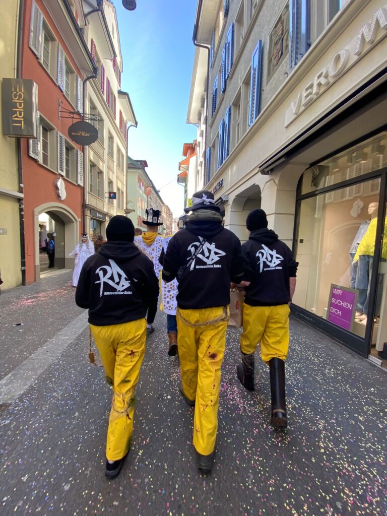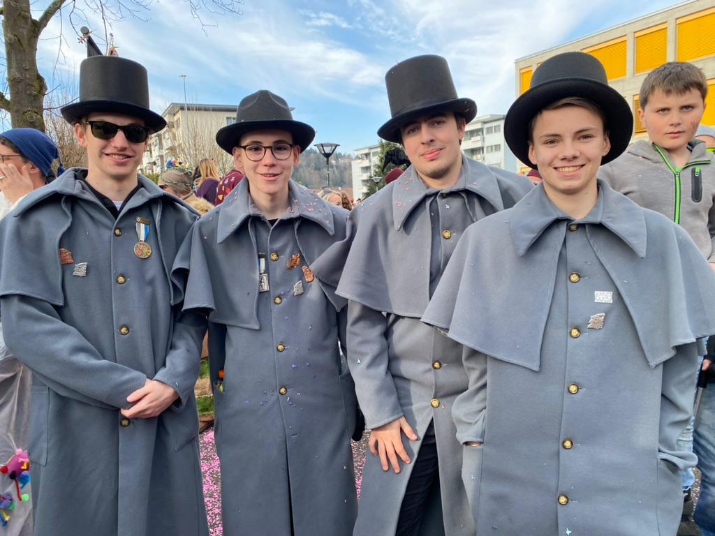 Wel sie so öberzügt gsi send vo erem Kostüm letscht Johr, hends gfonde sie legget grad no eine druf. So hends ofemene lääre Parkplatz ide Gmeinschaftsgarage scho de erscht wage baut. Ond so send de Livio, de Fabio ond de Leo zäme ad d’Fasnacht. I dem Johr sends au s’erschte mol mitere Nommere am Äbiker Omzog metgloffe.