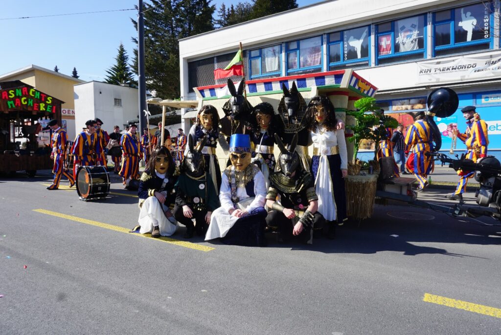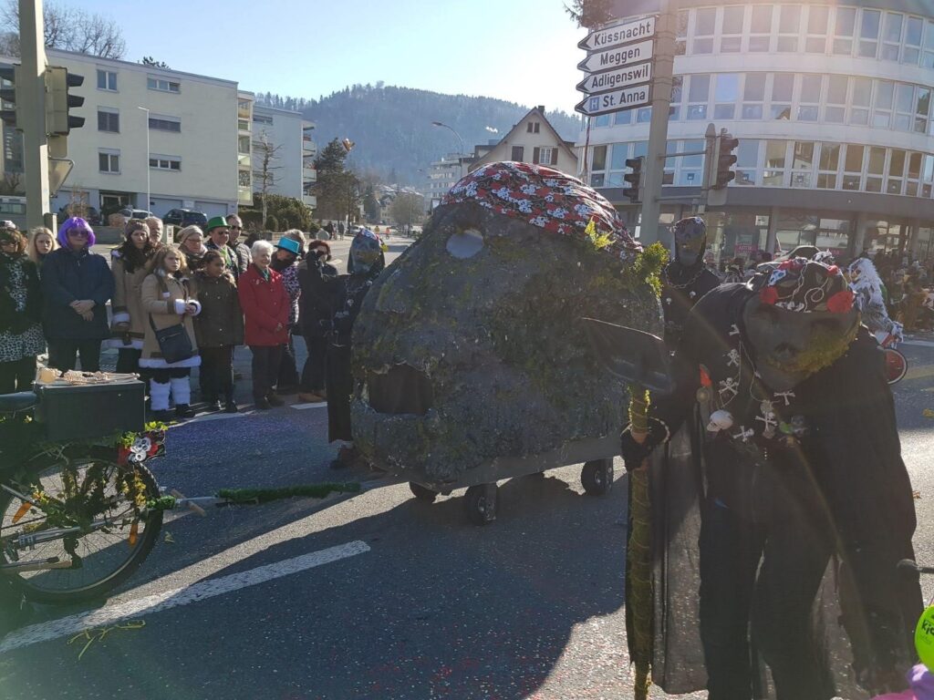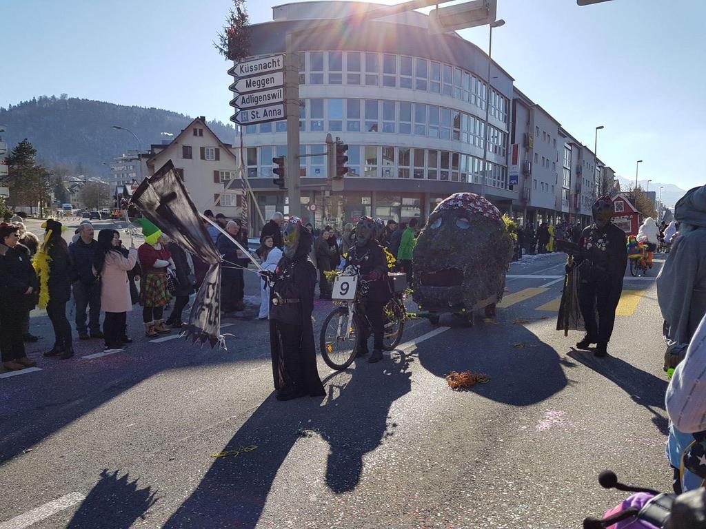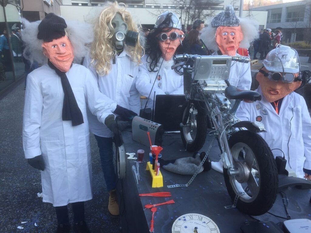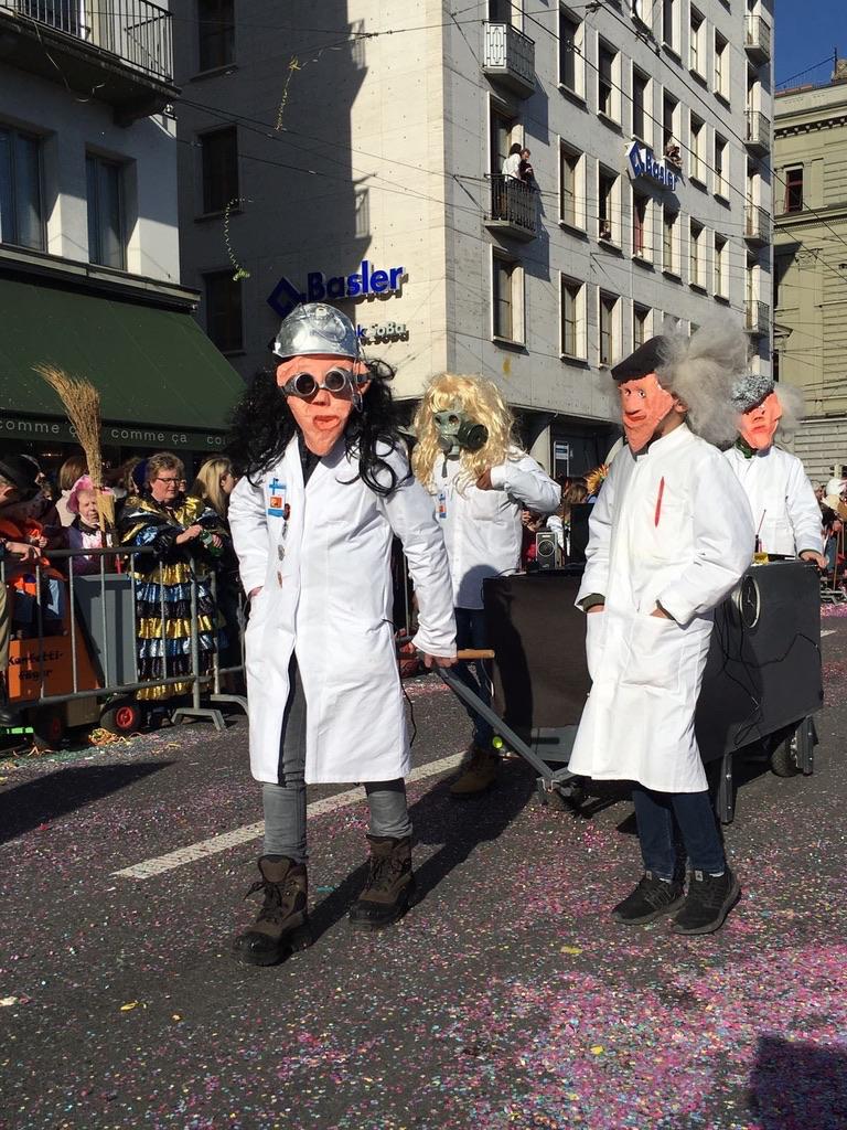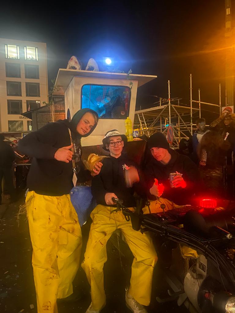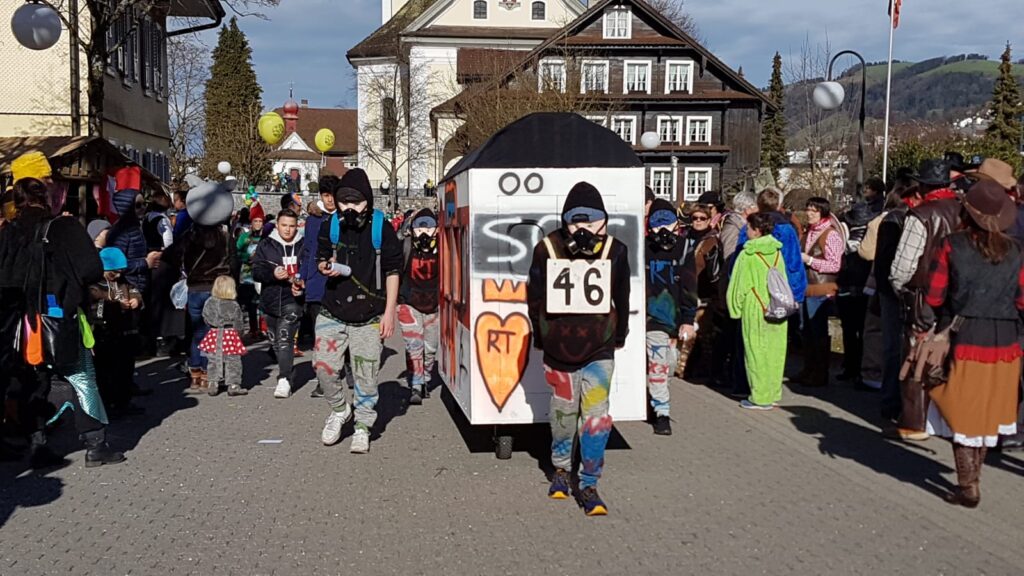 Wel sie so öberzügt gsi send vo erem Kostüm letscht Johr, hends gfonde sie legget grad no eine druf. So hends ofemene lääre Parkplatz ide Gmeinschaftsgarage scho de erscht wage baut. Ond so send de Livio, de Fabio ond de Leo zäme ad d’Fasnacht. I dem Johr sends au s’erschte mol mitere Nommere am Äbiker Omzog metgloffe.