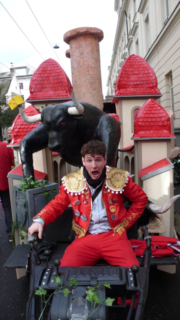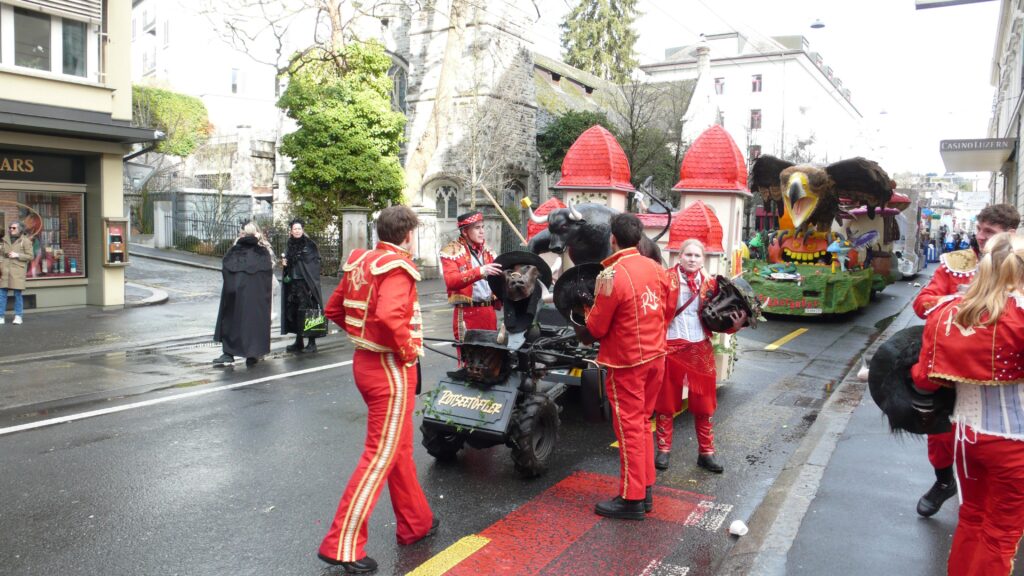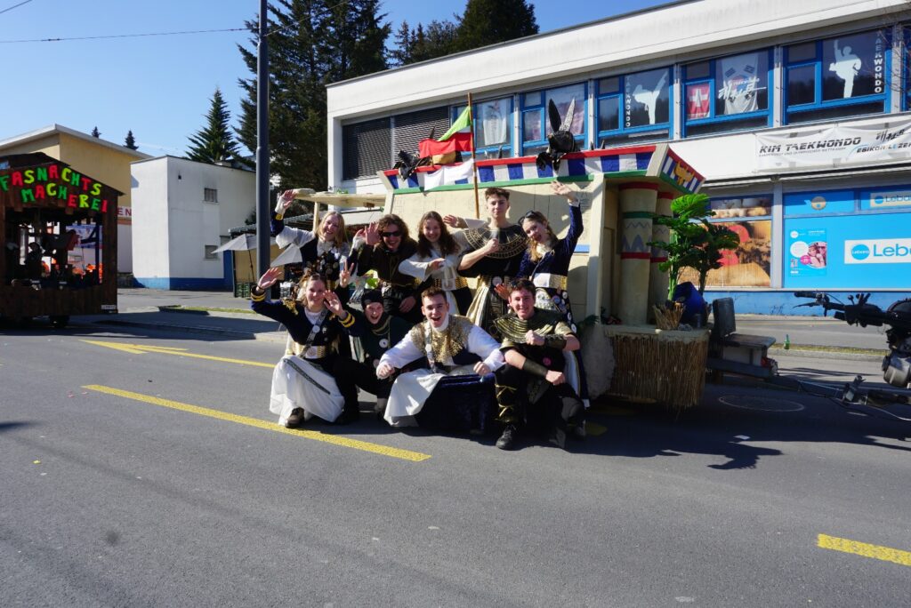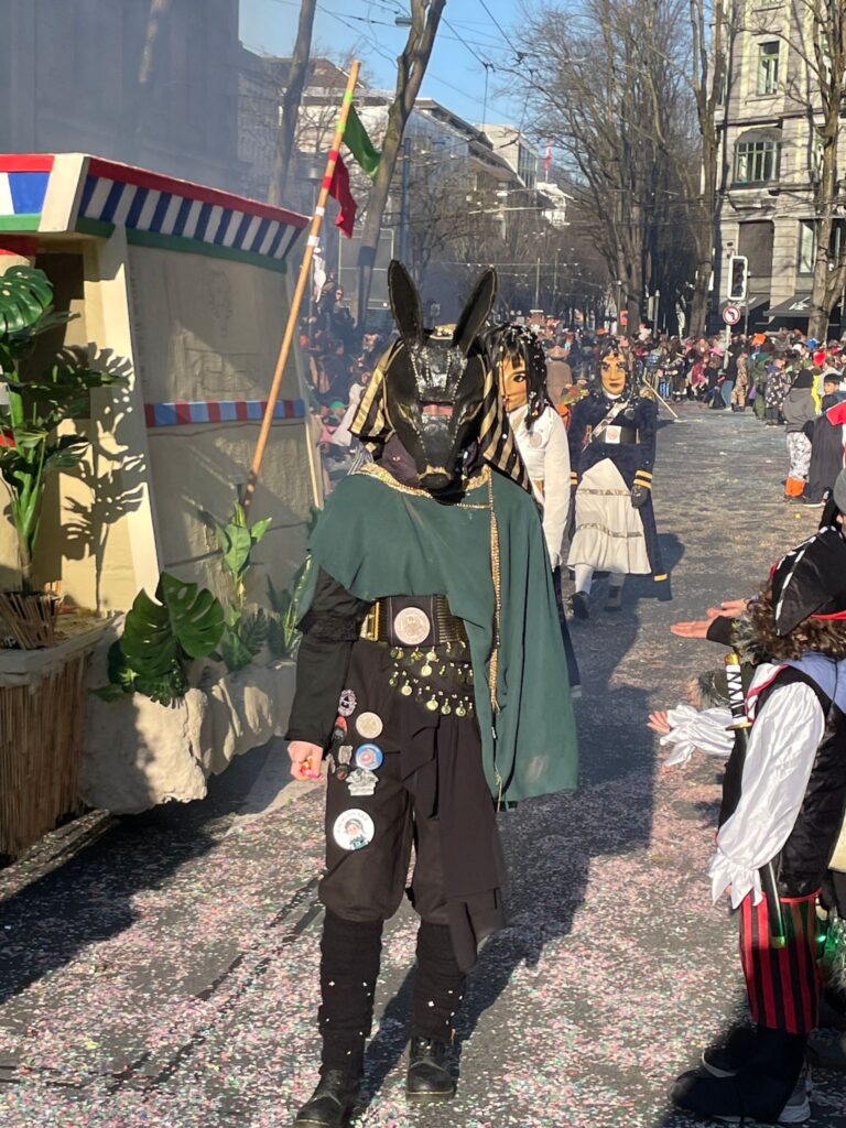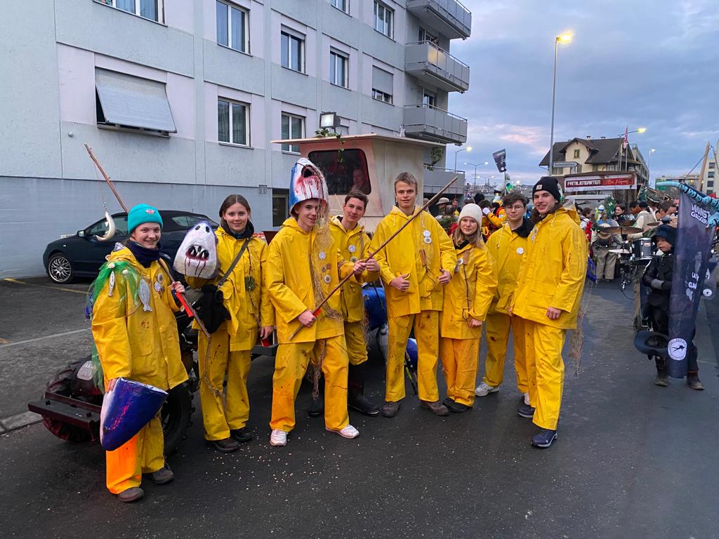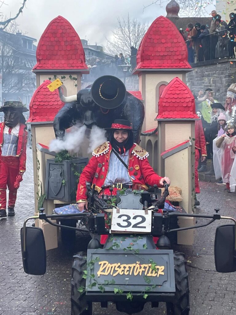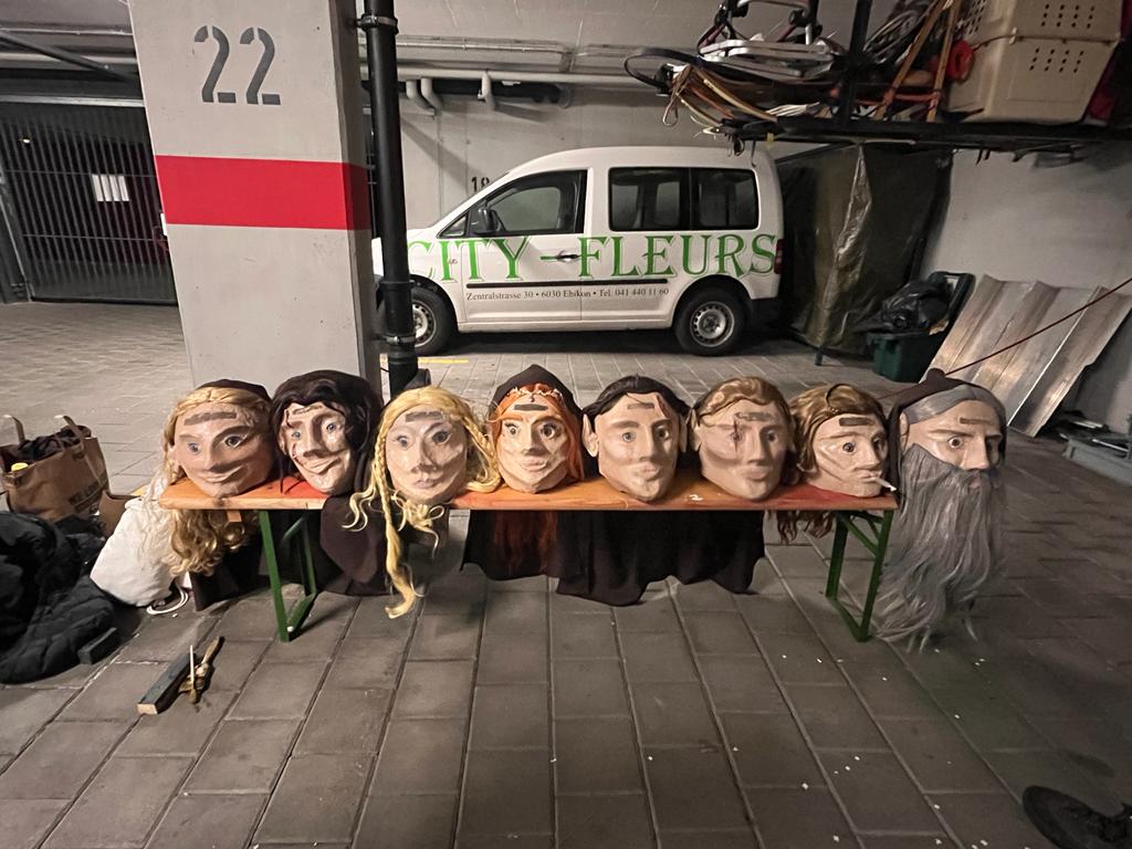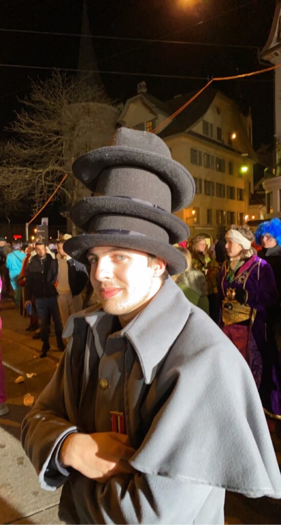 Wel sie so öberzügt gsi send vo erem Kostüm letscht Johr, hends gfonde sie legget grad no eine druf. So hends ofemene lääre Parkplatz ide Gmeinschaftsgarage scho de erscht wage baut. Ond so send de Livio, de Fabio ond de Leo zäme ad d’Fasnacht. I dem Johr sends au s’erschte mol mitere Nommere am Äbiker Omzog metgloffe.