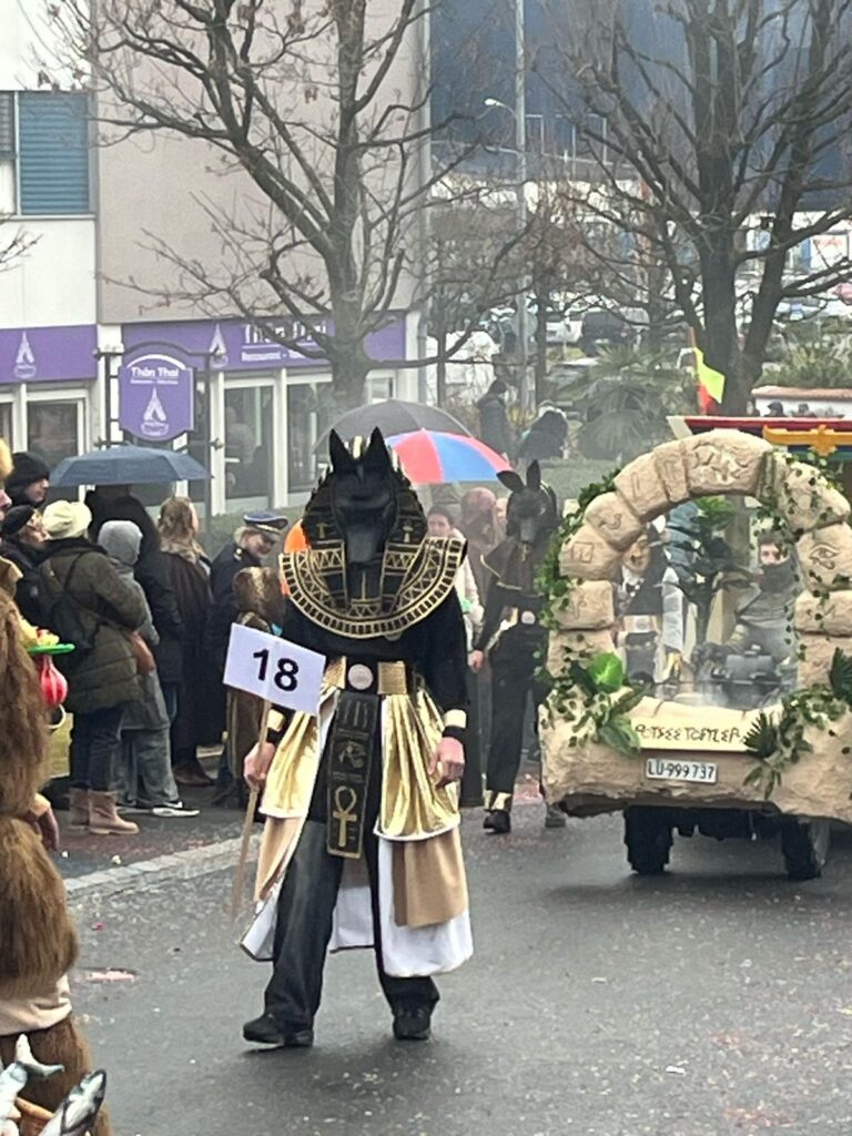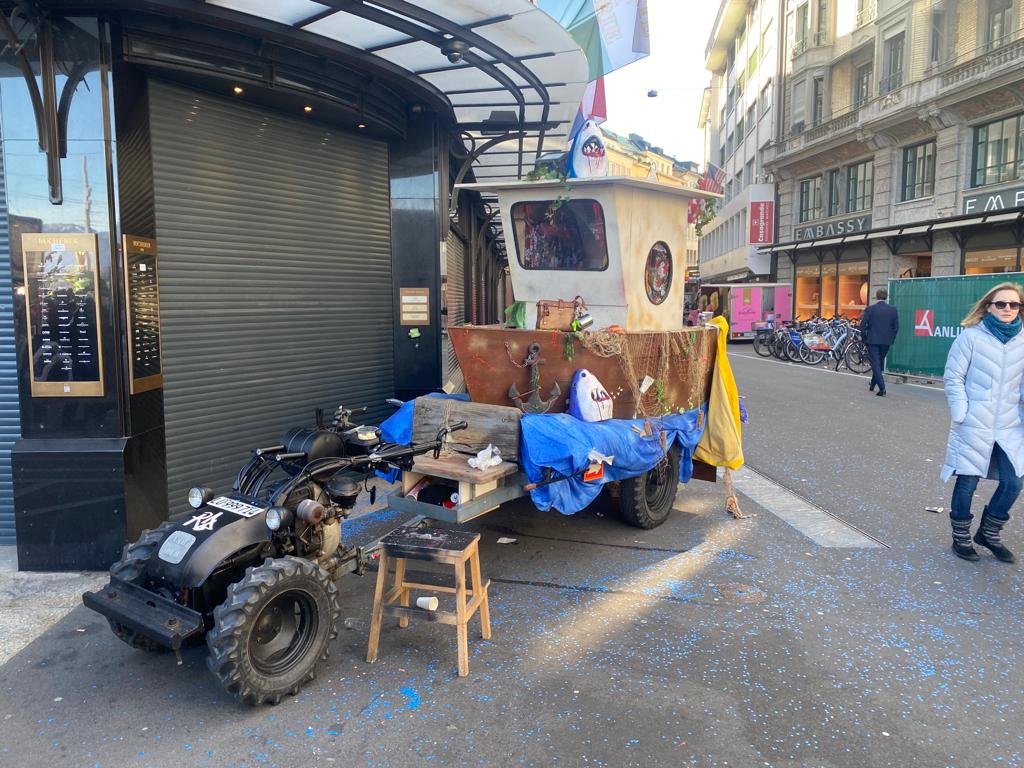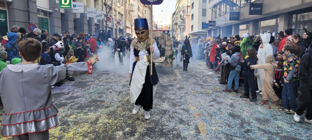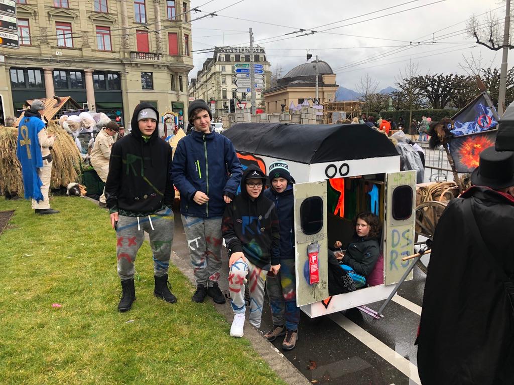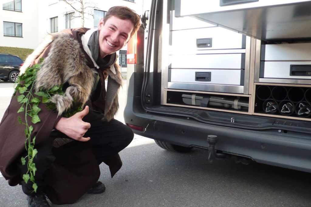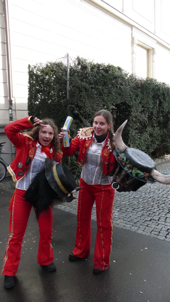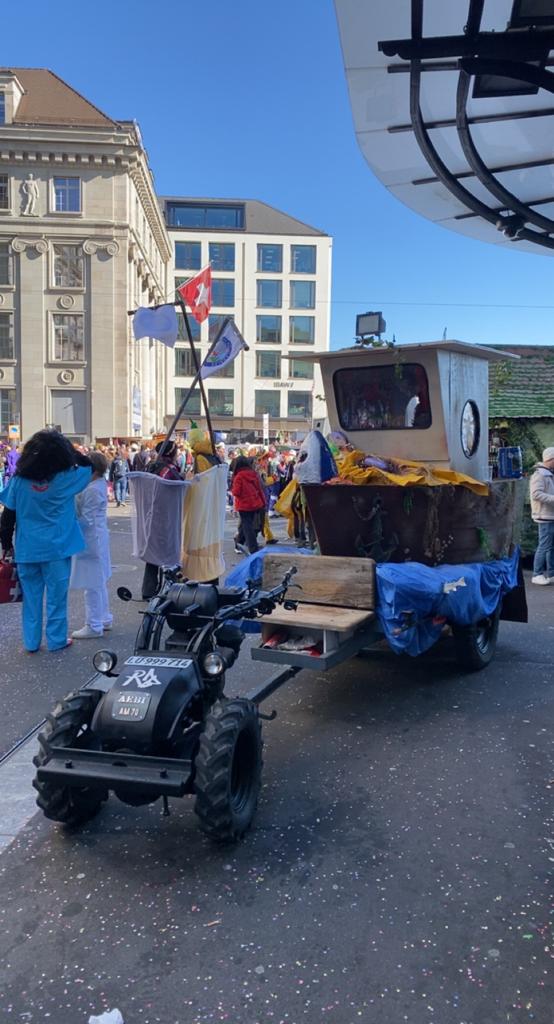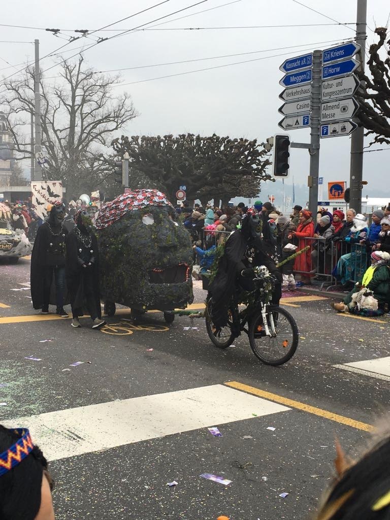 Wel sie so öberzügt gsi send vo erem Kostüm letscht Johr, hends gfonde sie legget grad no eine druf. So hends ofemene lääre Parkplatz ide Gmeinschaftsgarage scho de erscht wage baut. Ond so send de Livio, de Fabio ond de Leo zäme ad d’Fasnacht. I dem Johr sends au s’erschte mol mitere Nommere am Äbiker Omzog metgloffe.